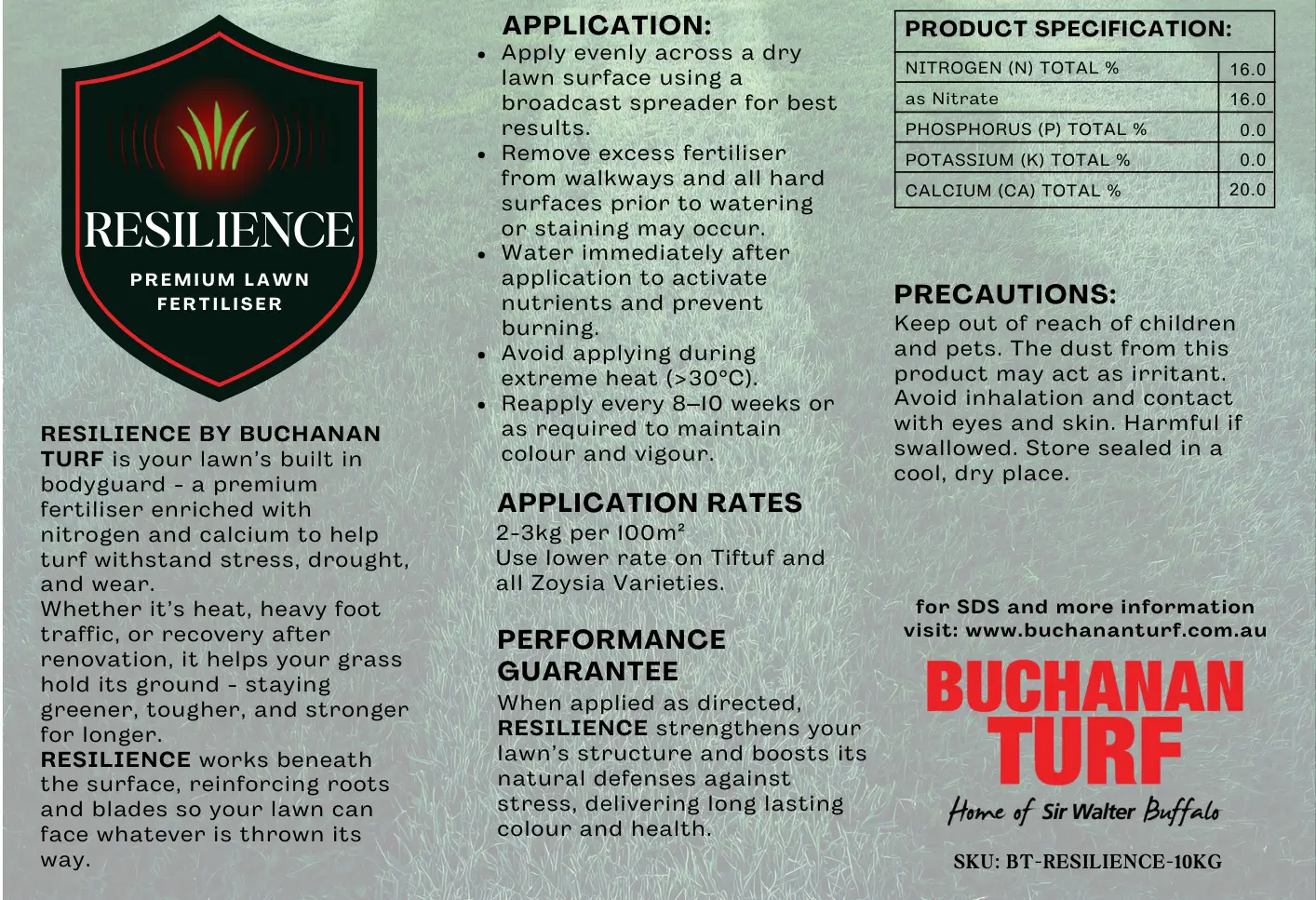 RESILIENCE by Buchanan Turf is a premium fertiliser formulated to help lawns withstand stress, wear, and challenging conditions.