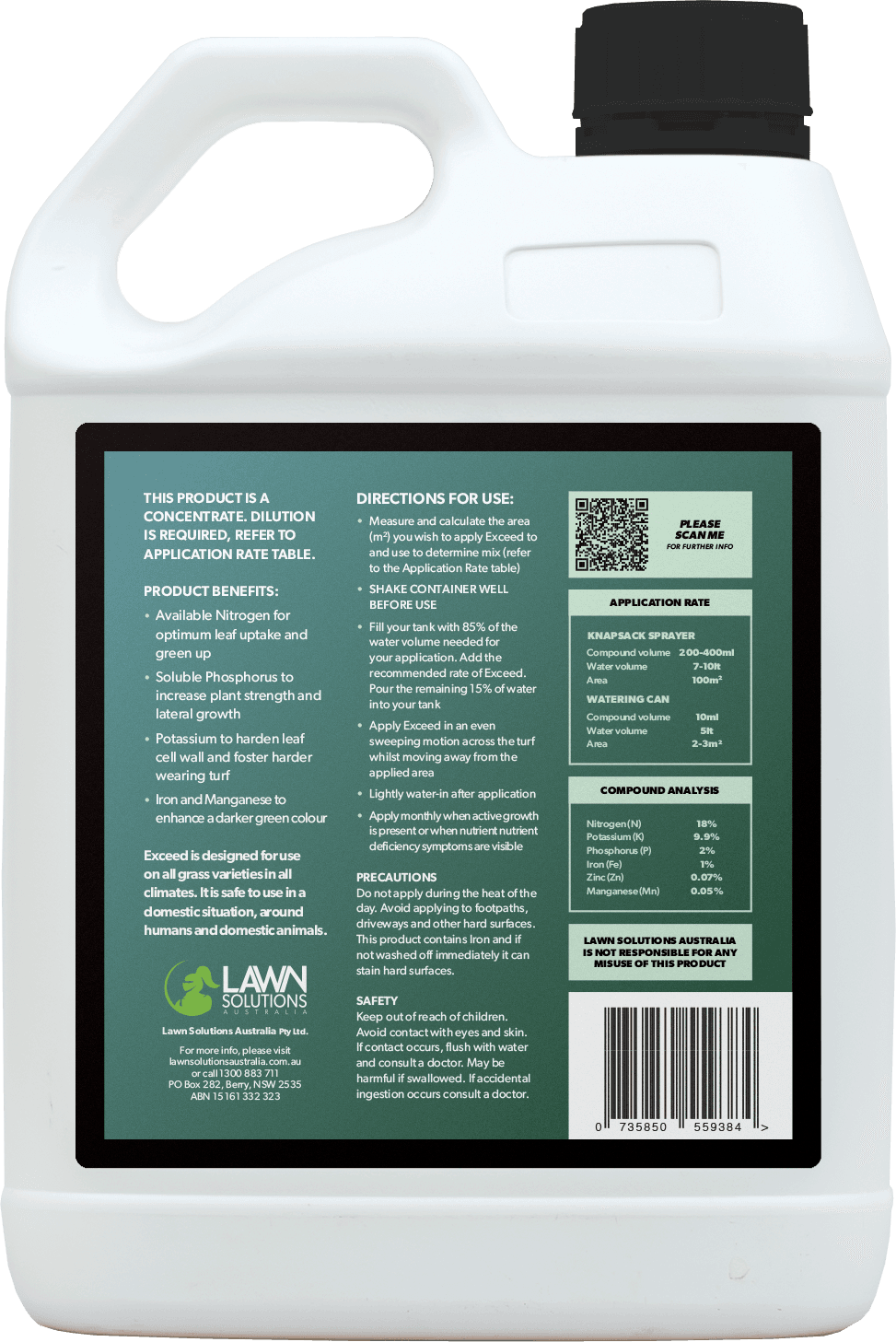 Exceed Liquid Fertiliser is a premium, professional foliar fertiliser designed to bring out the best in any lawn. Exceed can be used on all grass types including kikuyu, couch, buffalo, zoysia and cool season varieties.